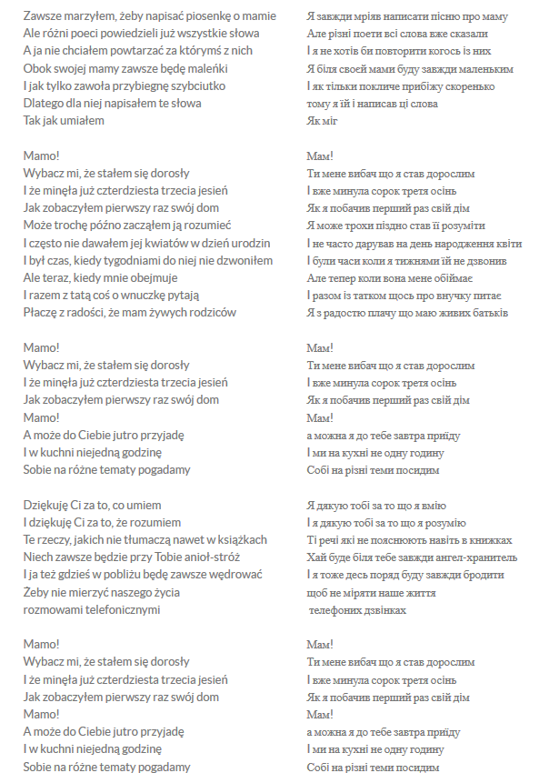 Wprawdzie tegoroczny Dzień Matki już za nami, ale co właściwie znaczy takie spóźnienie. Dla wszystkich mam piosenka po… ukraińsku. Poleciła moja dobra koleżanka z pracy. Warto poświęcić chwilę na wzruszenie. Gdyby ktoś nie do końca rozumiał, to poniżej tekst tej piosenki.