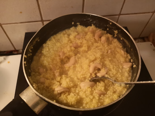 Dziś drugi dzień zmagań kuchennych. Tym razem na słodko. Trzywarstwowe, jaglane coś, z migdałowym spodem, nadzieniem z kaszy jaglanej i nerkowców oraz wierzchem z karmelu z daktyli i masła orzechowego. Słodzony erytrolem. Potężnie kaloryczne, bo mnóstwo orzechów, kaszy, daktyli, piekielnie drogie, aż nie chce mi się liczyć, ale w końcu święta są raz w roku, no, powiedzmy, że dwa razy. Kalorie w pełni zdrowe i naturalne. Zobaczymy co z tego wyjdzie. Obecnie ciasto przebywa w lodówce celem stężenia. Spróbuję jutro zabrać ze sobą na wigilię do ojca i siostry. A było tak: