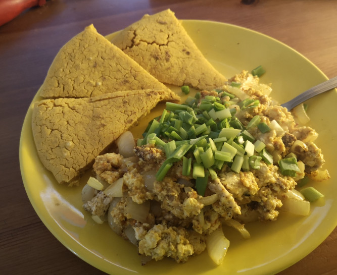 Dziś na obiad była tofucznica (wiadomo – niedziela), ale hitem dodatkowym był chlebek ryżowy. Bardziej rodzaj grubego placka, pieczony 20 minut w piekarniku, z chrupiącą skórką, pysznym nadzieniem z pachnącymi ziołami. Super sprawa. Szybko, smacznie i zdrowo.