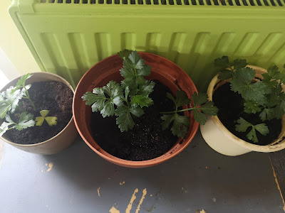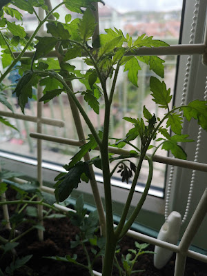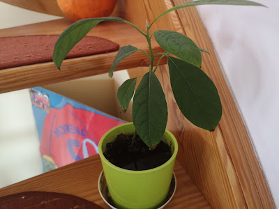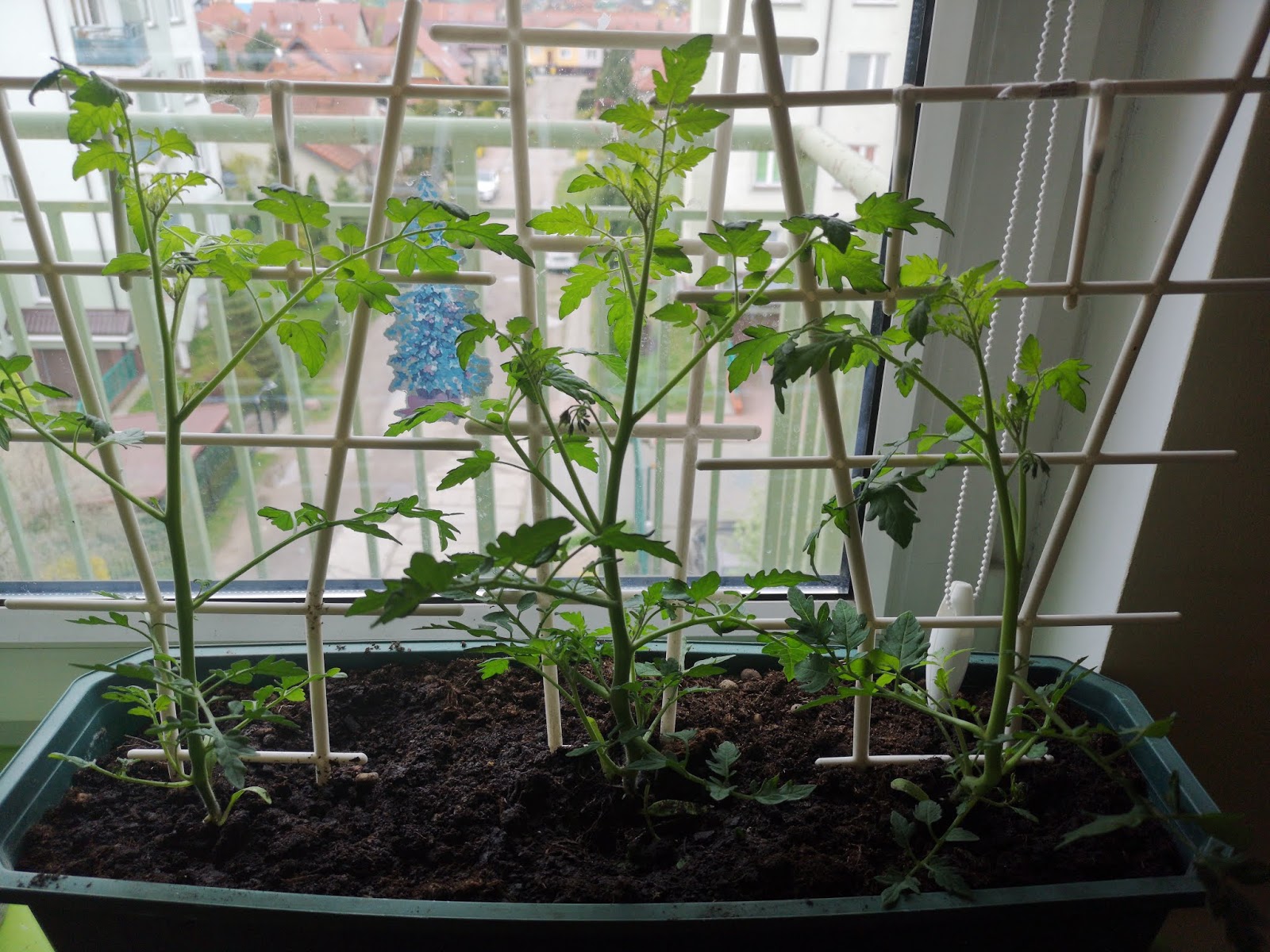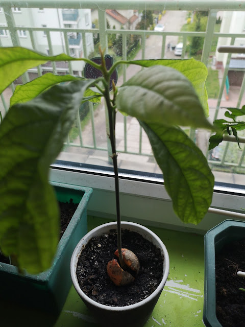 Dwie pestki avocado – Księżniczka Awokadia, oraz jest Siostra, do tego trzy, pnące się w górę jak szalone, pomidorki – byc może cherry, ale to nie jest do końca pewne, krzaczek być może lawendy, oraz trzy sadzonki selera. To cała moja obecna ekipa pokojowa. Na razie dajemy radę, walczymy o życie i jest dobrze.