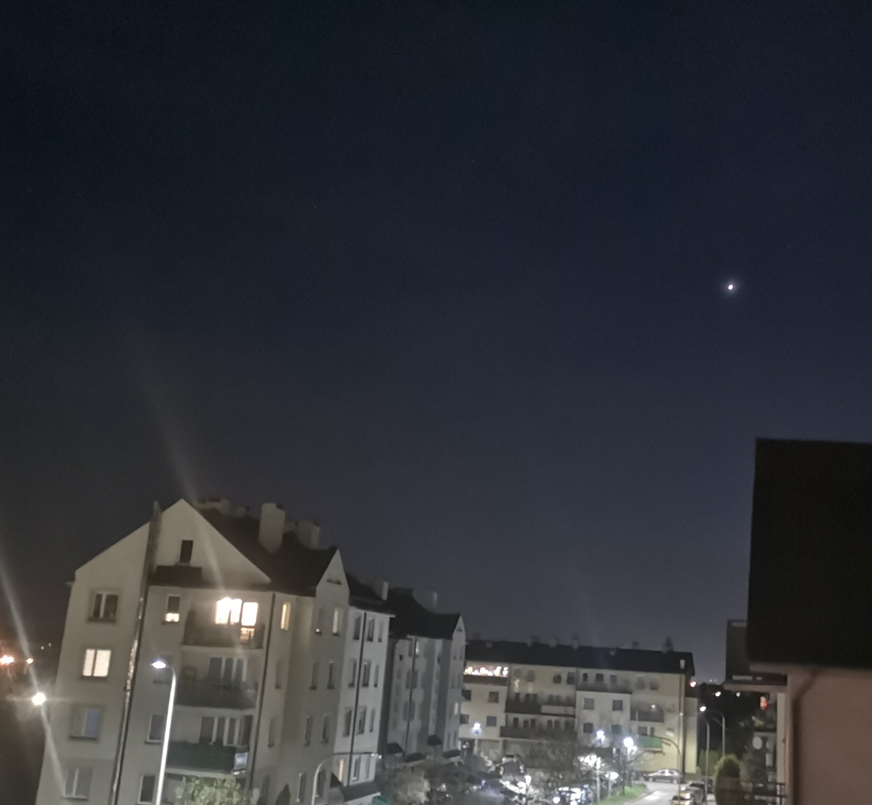 Pięknie wczoraj świeciła na niebie planeta Wenus. Niebywale jasna. Kawałek dalej jest Mars, ale jest zbyt blady, żeby wyszedł na zdjęciu, a może to dlatego, że Księżyc był bardzo jasny tej nocy. W dole sonda Rosette, ścigająca kometę Czuriumow/Gierasimienkow.
